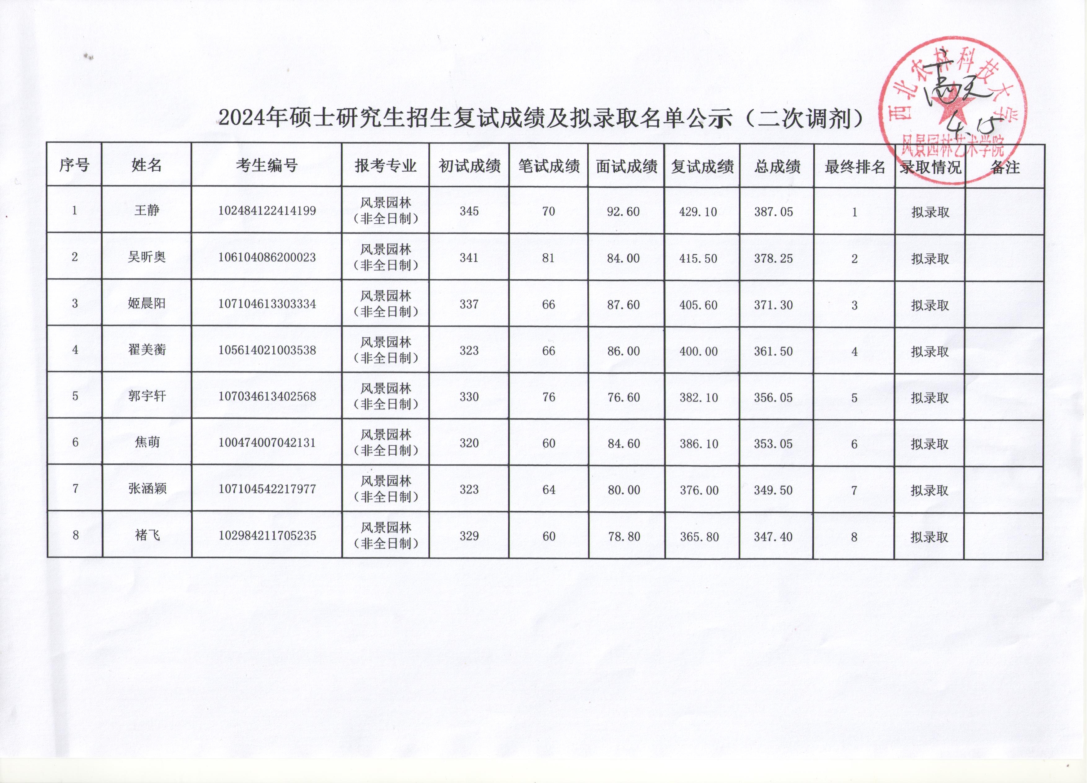 风景园林艺术学院2024年硕士研究生招生复试成绩及拟录取名单公示(三)