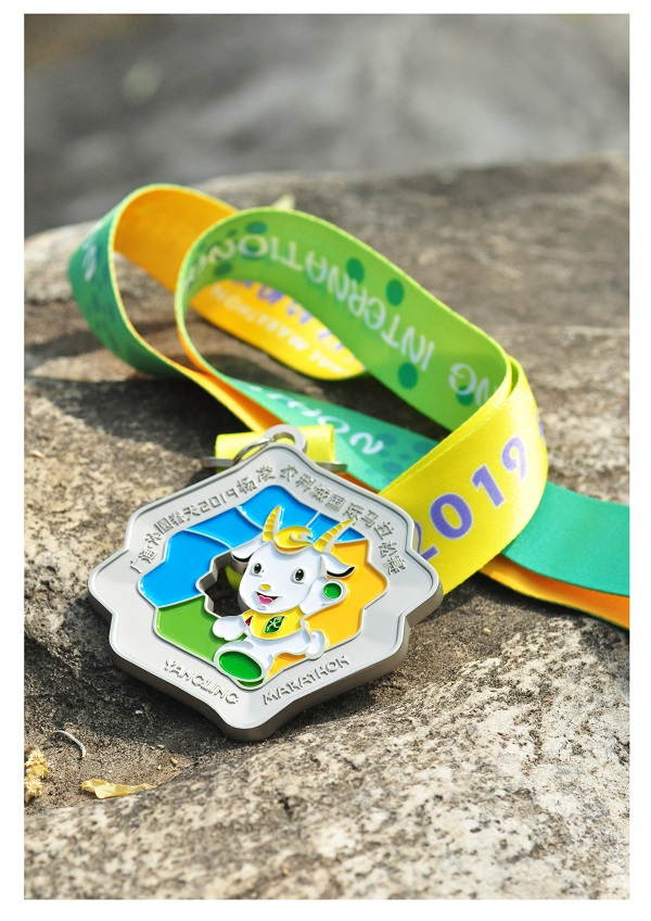 迷你奖牌造型以数字“5”的同形异构为创意,正面的线形设计延续主奖牌寓意,背面的田园风光以浮雕的形式呈现。5颗亮钻点缀其中,再搭配亚光银色调,使整体奖牌极具动感与时尚气息。亲子酷跑奖牌依旧采用吉祥物“凌凌”作为代言人,以舞动的丝带勾勒整体造型,结合卡通、可爱的风格将“凌凌”凸显出来。色彩上选用了青春靓丽的蓝、橙与绿,象征着热情、欢乐、陪伴与幸福。