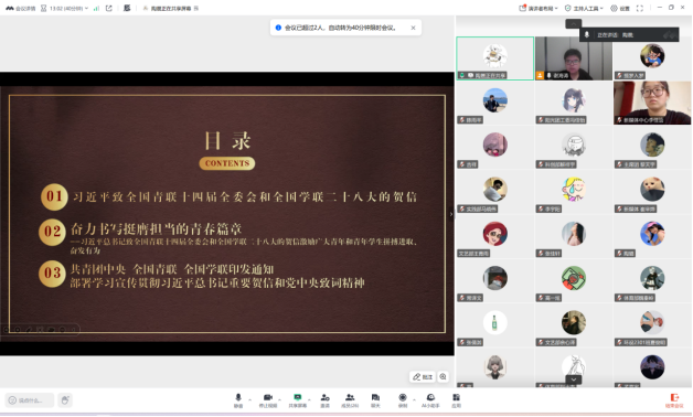 为深入贯彻落实习近平总书记关于高等教育和农业现代化系列重要论述精神,深刻领会党中央对新时代高等农业教育的战略擘画与殷切期望,2025年8月22日,学院团委学生会成功组织召开了以“学习领袖贺信,勇担时代使命”为主题的线上政治理论学习会。会议集中学习了习近平总书记给全国青联十四届全委会和全国学年二十八大的贺信,并围绕贺信精神开展了深入研讨。院学生会、研究生会全体成员参加了本次学习。