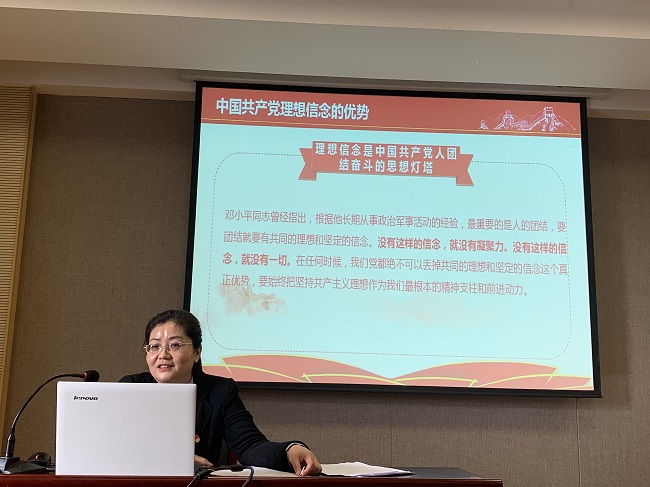 她在专题党课中讲到,一要系统学习马克思主义基本理论,做到真学真懂真信真用;二要坚持不懈加强思想教育这个根本,形成长效机制;三要以典型事例、榜样示范激发情感共鸣,增进对理想信念的心理认同;四要在中华优秀传统文化的滋养中追溯理想信念教育的历史文化基因,增进对理想信念的文化认同;五是必须“顶天立地”,融入细微的日常生活感悟才能可感、可亲、可信。