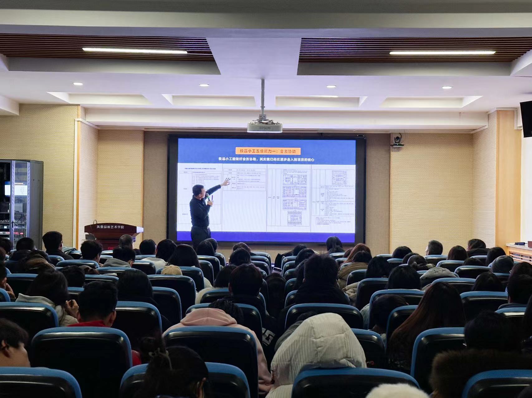 座谈会前,邀请中建五局装饰幕墙设计院方案所所长贺立红作“现在设计未来2023:大时代下,一位设计人的思考”主题报告,贺立红从设计行业的发展历程与产业链分析,未来从业人员需要具备怎样的认知升级与技能储备等方面为120余名本研学生做了全面地讲解和深入地研讨交流,进一步引导学生清晰认知未来职业前景,明确就业方向目标。
